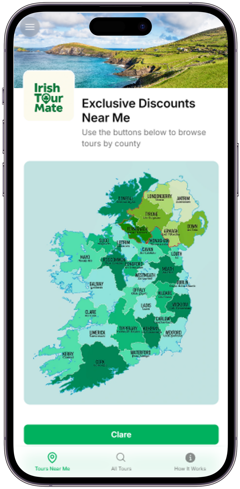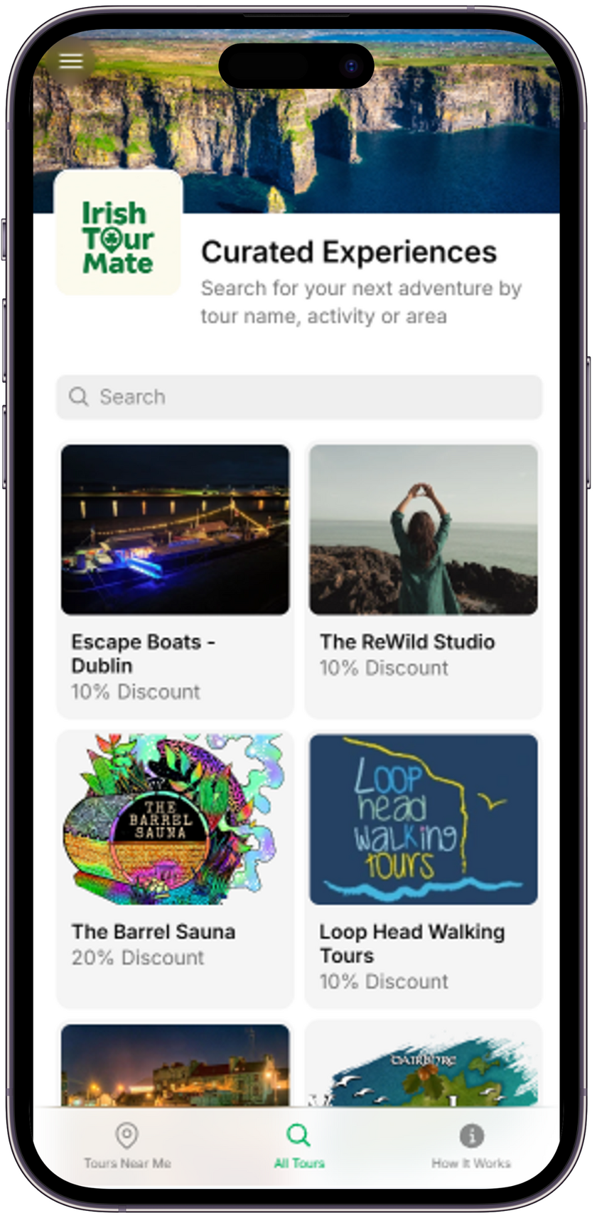 Irish Tour Mate gives you instant access to 100+ curated discounts, instant redemption and seamless booking โ all in your pocket.