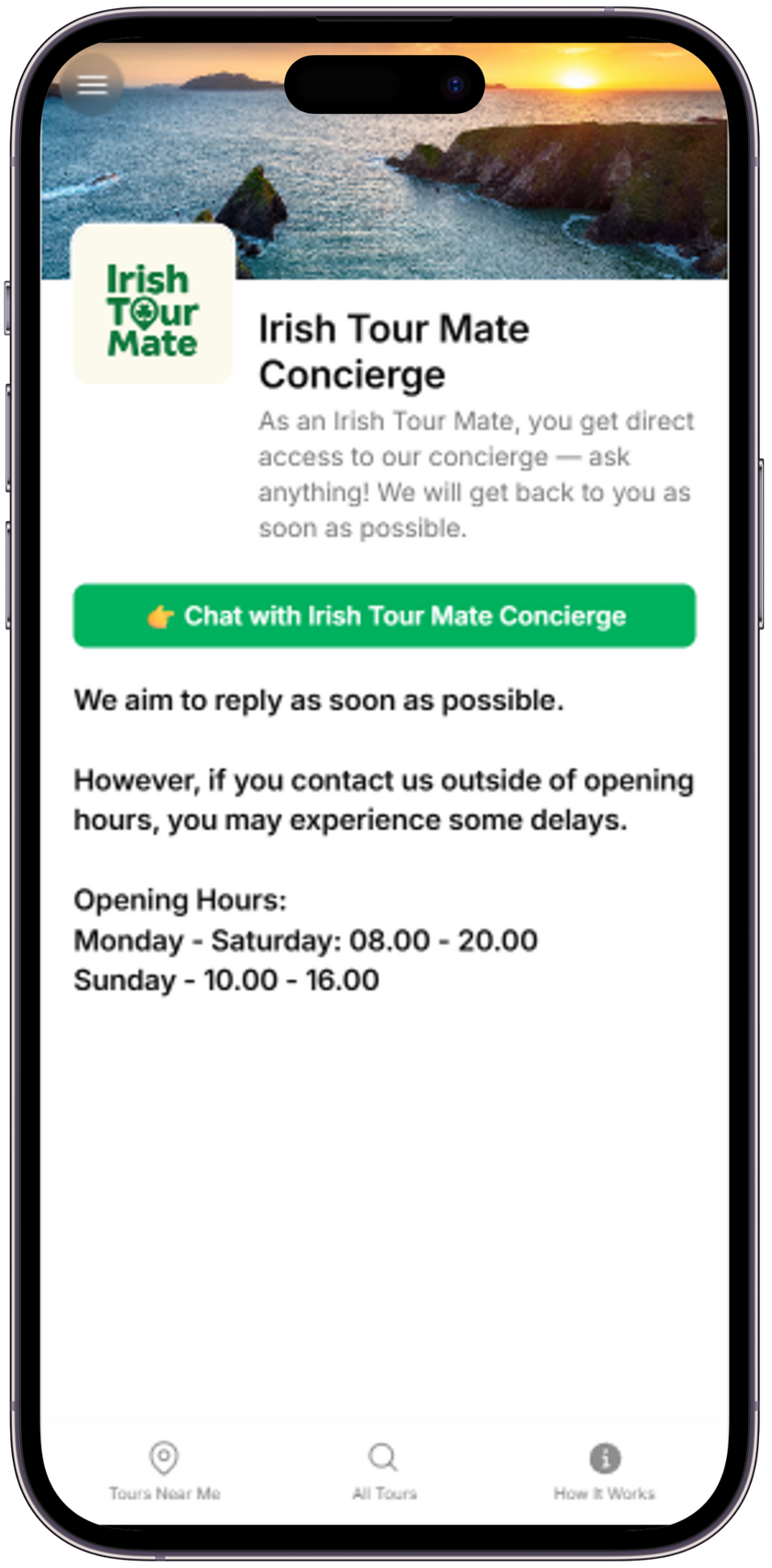 From hand-picked authentic Irish experiences with exclusive discounts, to live concierge help, Irish Tour Mate gives you more ways to explore and save.